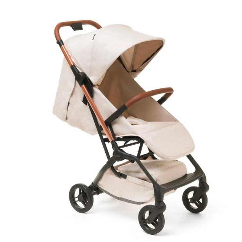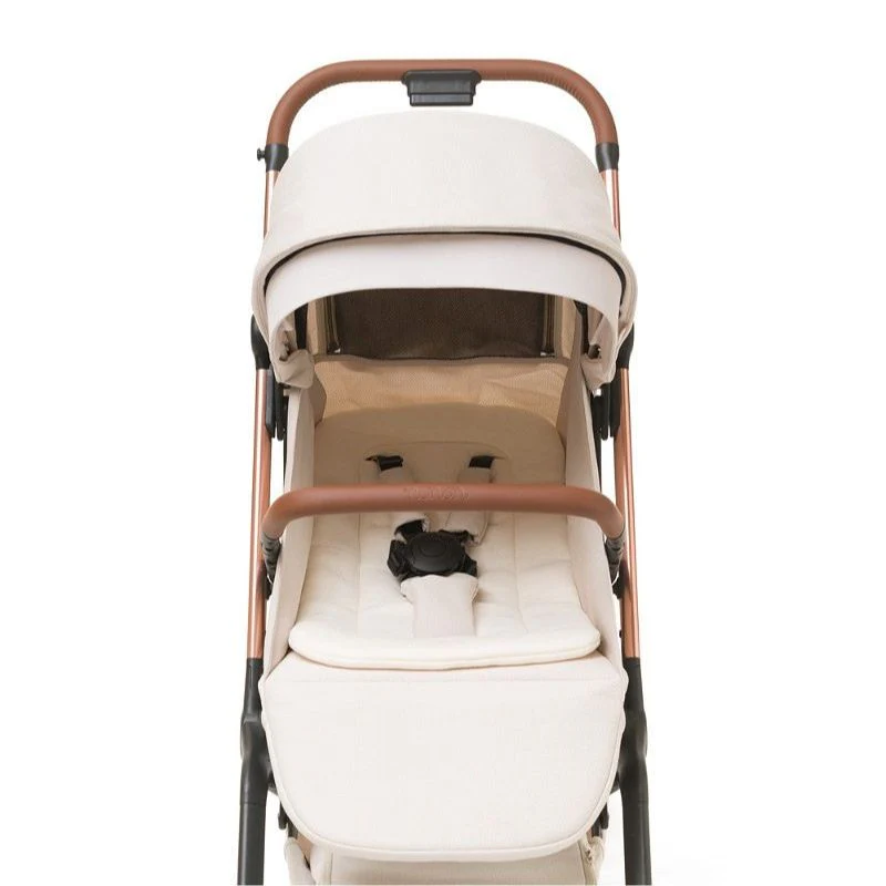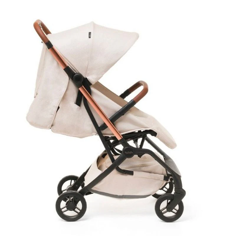 Tessuto Jacquard, telaio senza rivetti a vista, con tubo laterale in finitura oro rosa, manici in ecopelle, ruote in Poliuretano e tutte con ammortizzatori per un maggiore comfort del bambino. Tutti i tessuti sono certificati OEKOTEX, rispettano l’ambiente: tessuti sia 100% riciclati che naturali, 100% cotone.