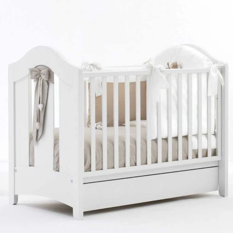 - Rete ortopedica interamente realizzata a doghe di legno con due posizioni: per il neonato sistema in alto, facilitando così il lavoro alla mamma, si sistema più in basso quando il bambino sa già arrampicarsi e ha bisogno di sponde alte per non cadere.